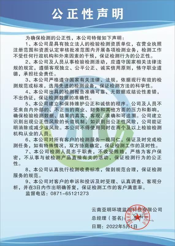 本公司将按照国家相关法律的规定,建立和持续改进管理体系,不断提高检测能力和管理水平,努力向各级环境主管部门及社会提供科学、公正、准确、可靠的检测服务。